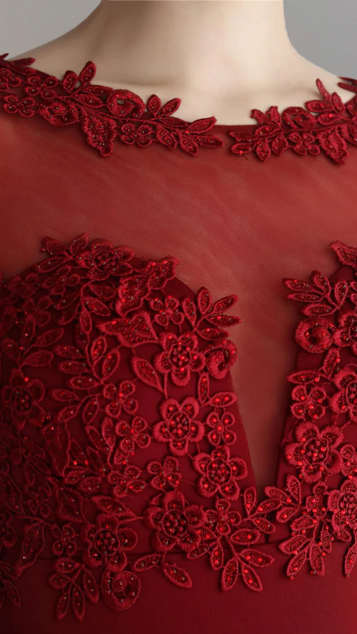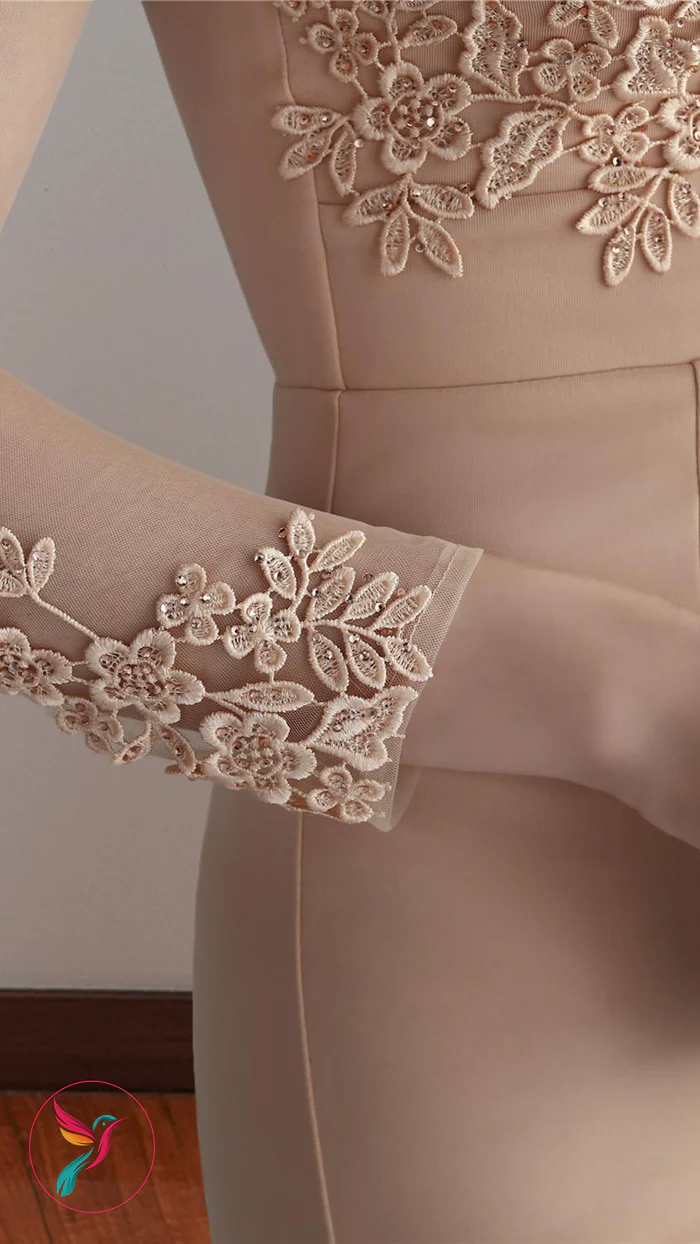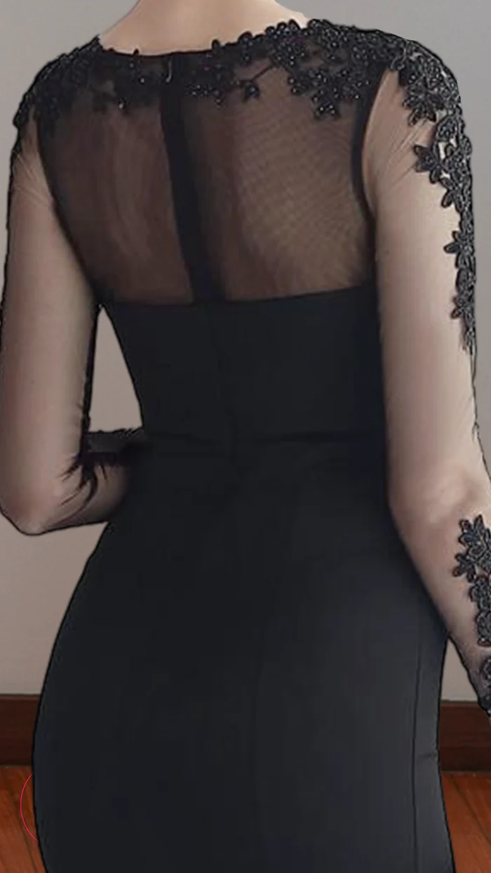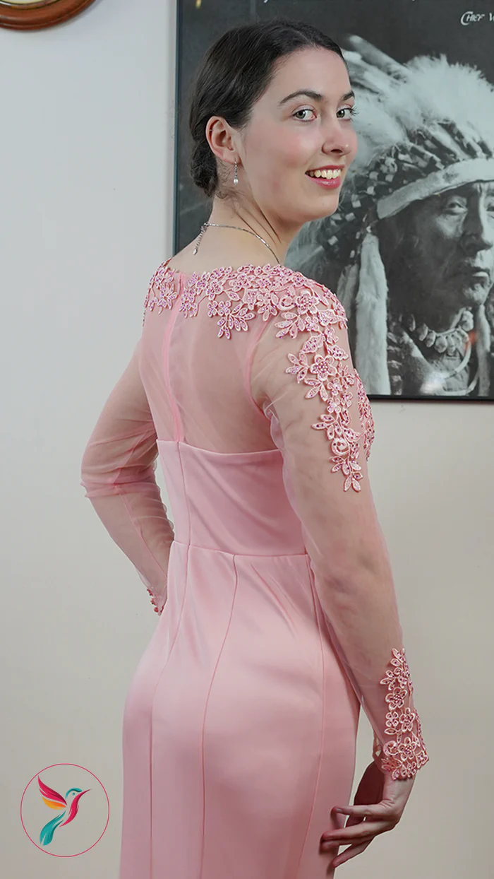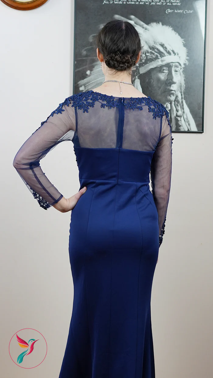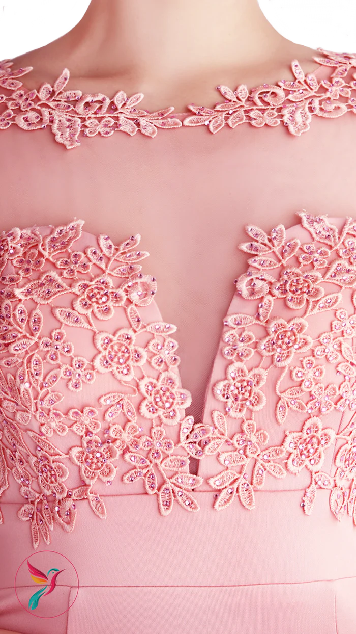 This long evening gown features a round neckline, long sleeve bodice with beautiful flower embroidery, sheer embellished back, full length skirt that elegantly flows to the floor, and a invisible zipper closure. This Maxi Length dress is the perfect choice for any up coming event.