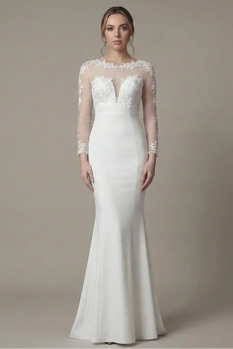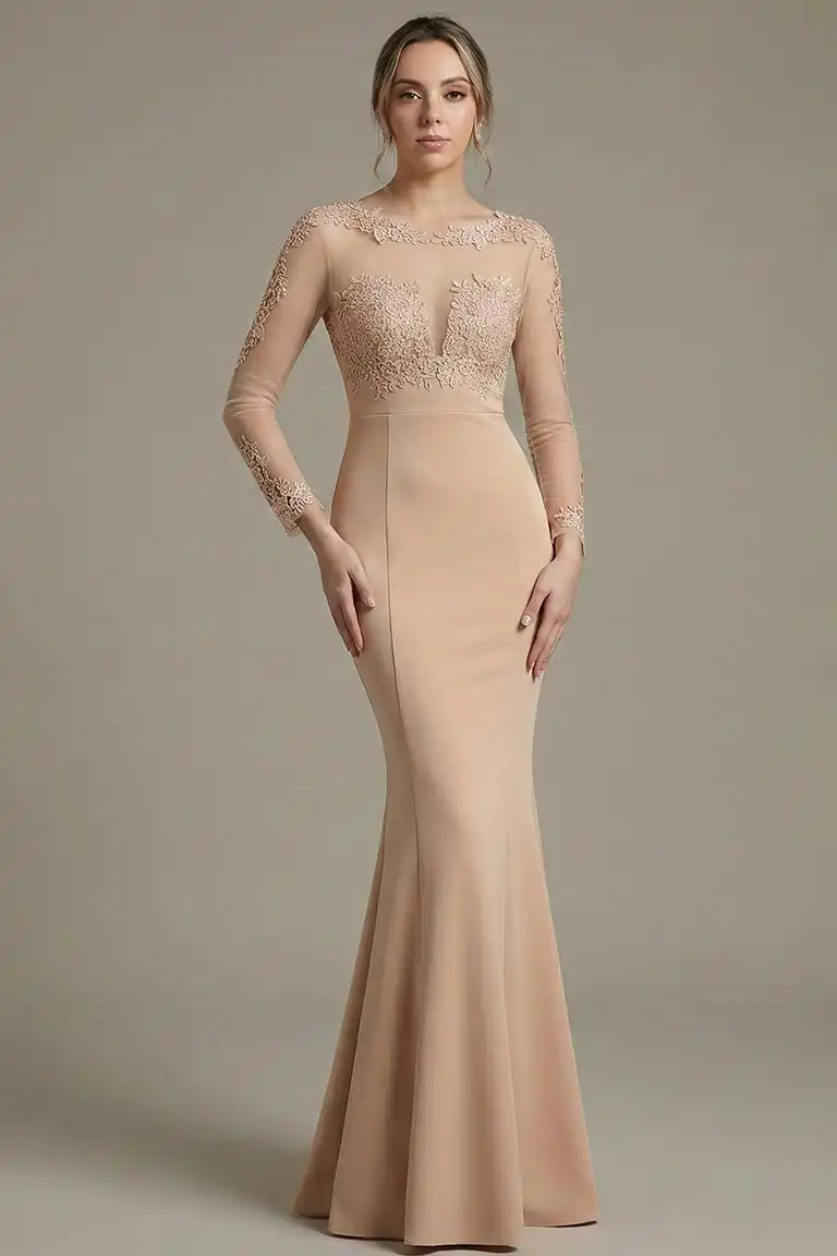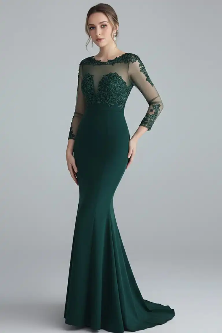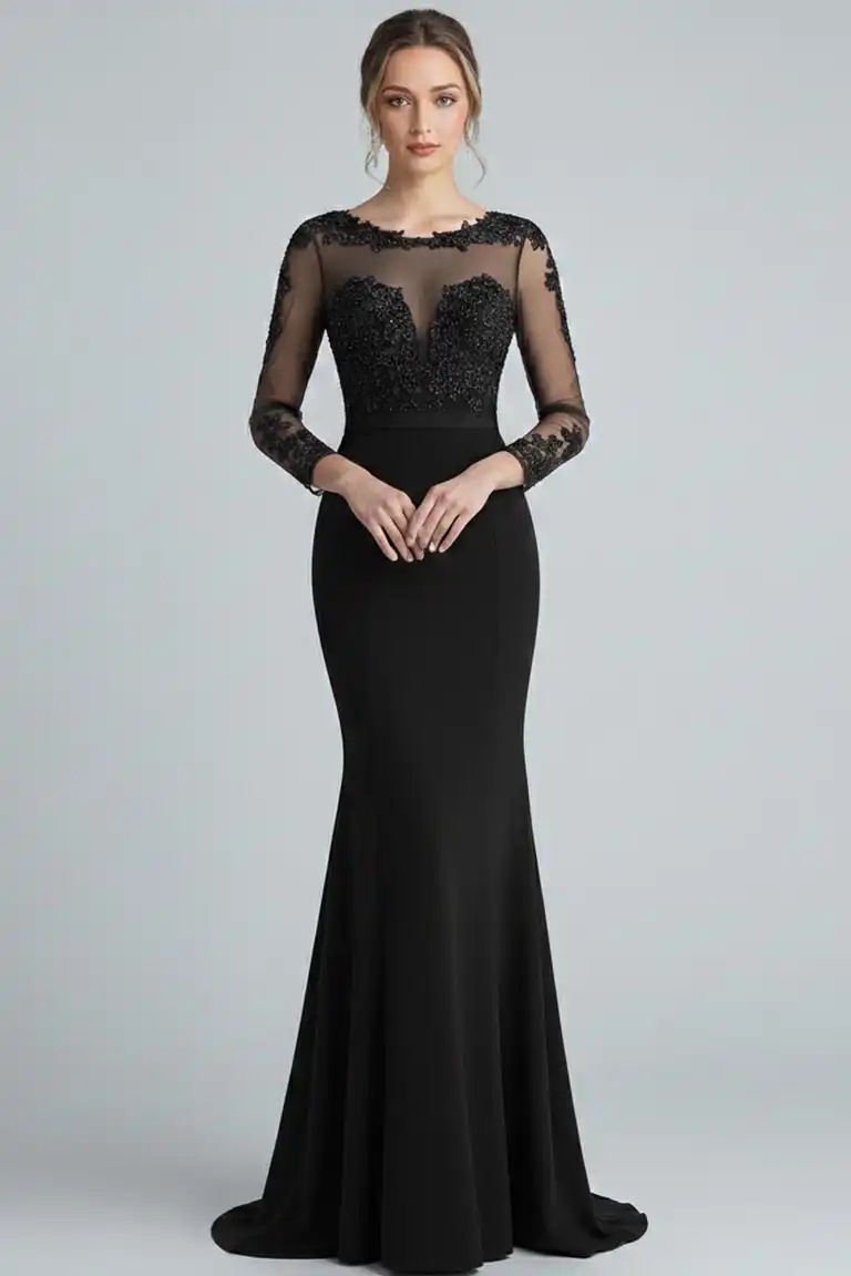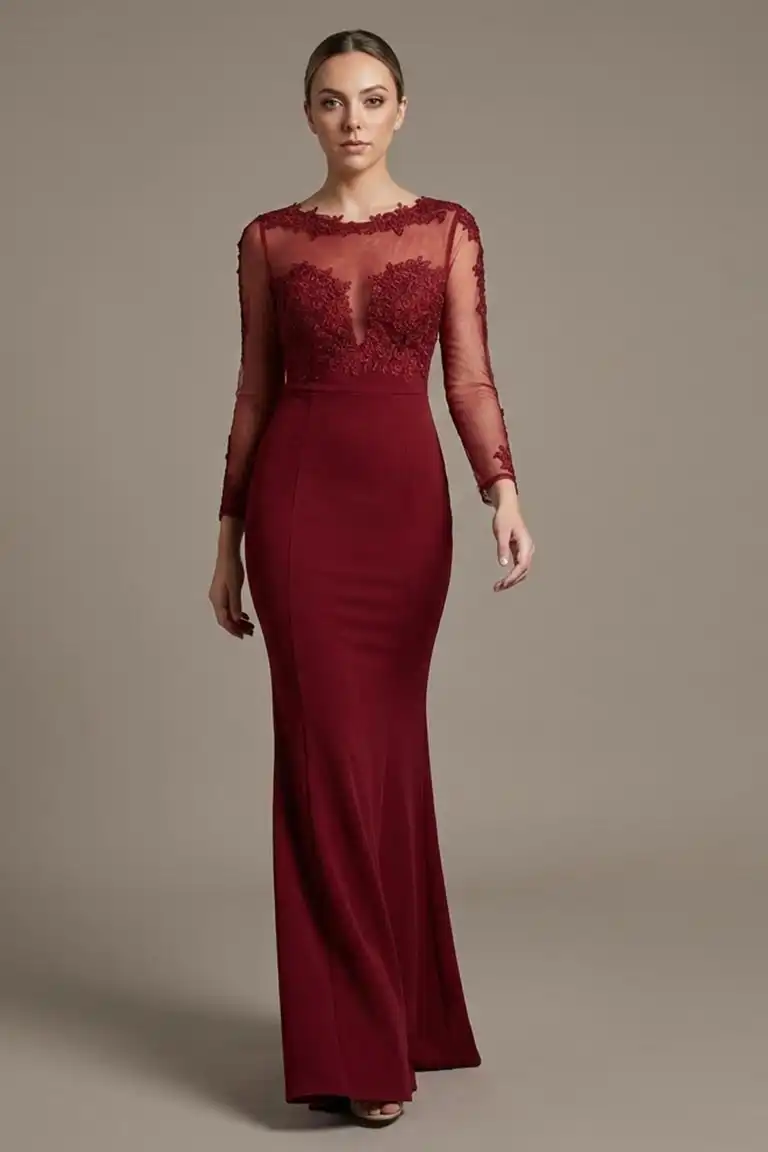 This long evening gown features a round neckline, long sleeve bodice with beautiful flower embroidery, sheer embellished back, full length skirt that elegantly flows to the floor, and a invisible zipper closure. This Maxi Length dress is the perfect choice for any up coming event.